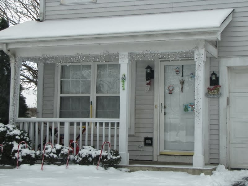 Сделали венок на входную дверь. Без веночка на улице были просто гирлянды на крыльце и тросточки около крыльца, плюс наклейки на стекло, да ещё пару штуковин на фонарях и колокольчики.