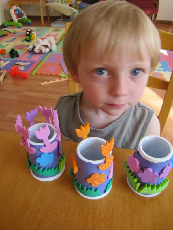 Обклеить баночки бумагой я ещё помогла, а потом Максим с Ромкой сами обклеивали свои горшочки цветами и травками.