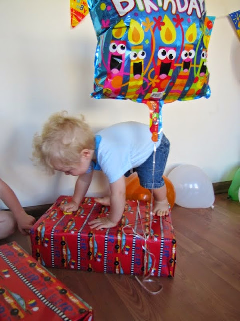 Распаковка подарков заняла некоторое время, т.к. Антон всё время отвелкался на шары и не сразу разобрался, что коробки нужно разворачивать и смотреть что внутри.